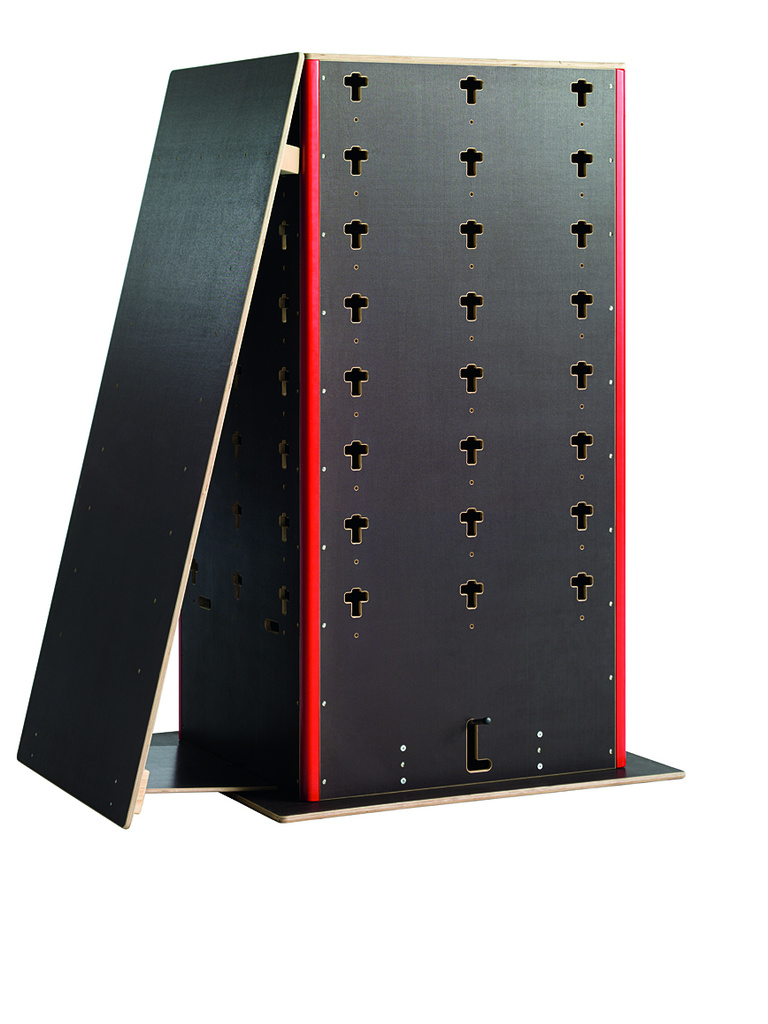 Naklonená doska je pripojená ku kocke. Môžu ju používať aj začiatočníci na tréning parkouru a akrobatické cvičenia, napríklad saltá.